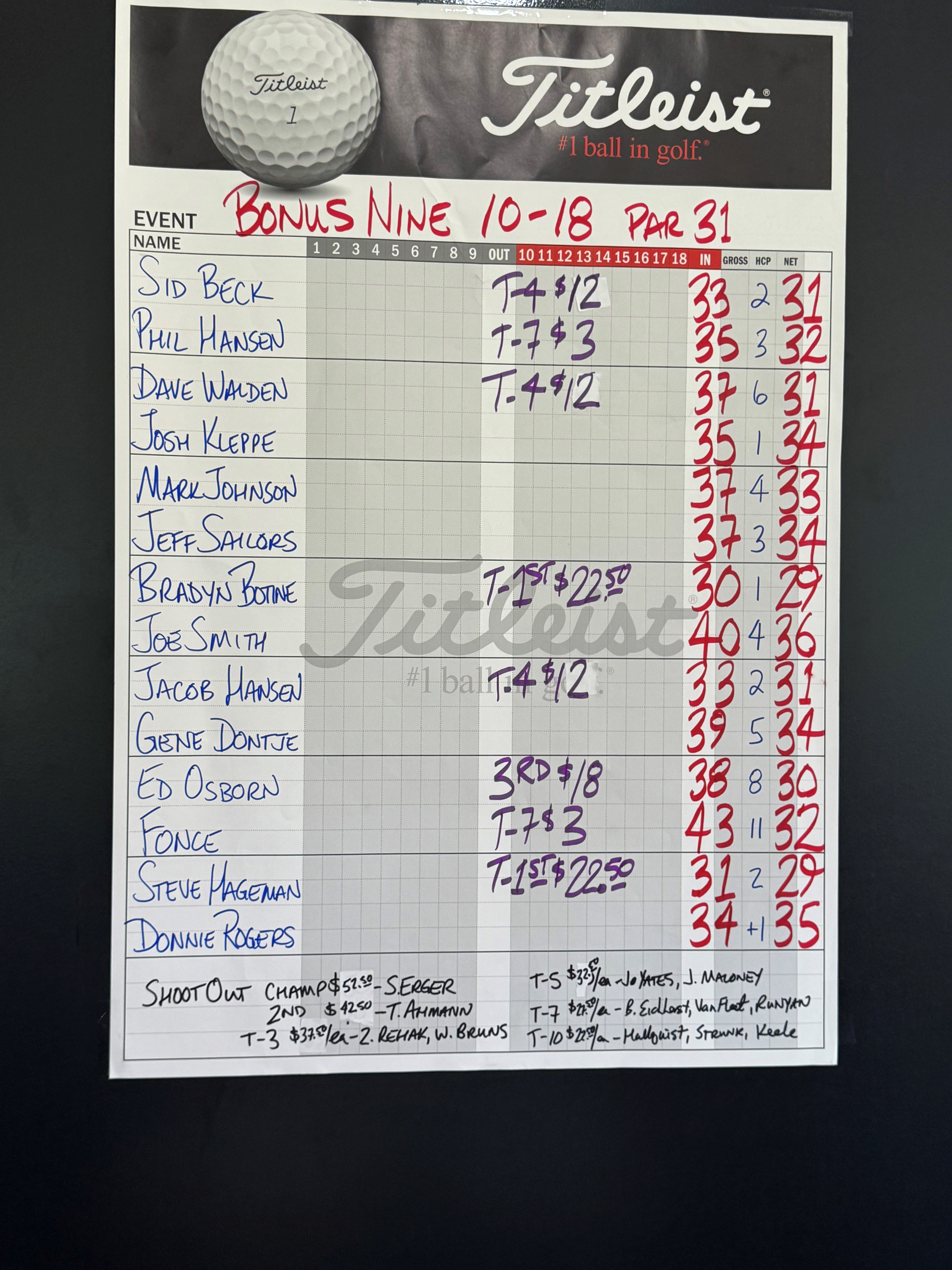 - Sunday, August 17th - Shoot Out, Max 32 players, 11am SG 1-9 & 1:30 SG 10-18 First Nine Results Final Results for Shoot Out and Fun Bonus Nine